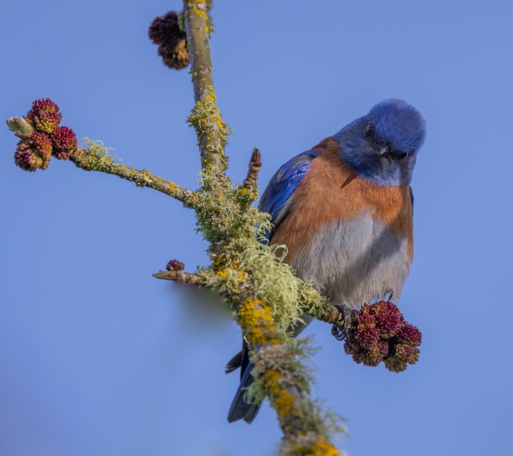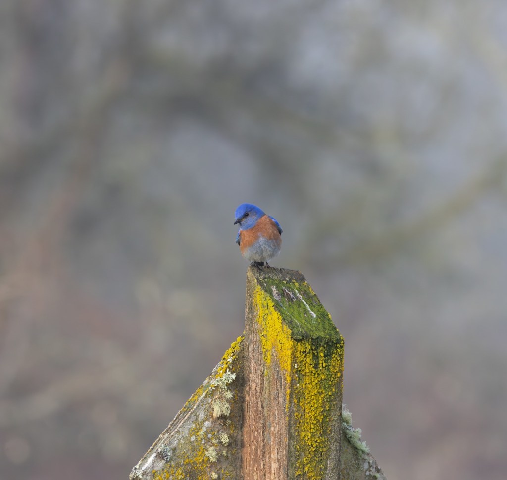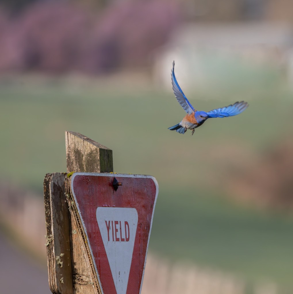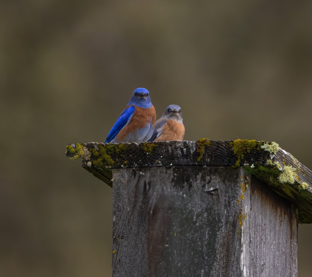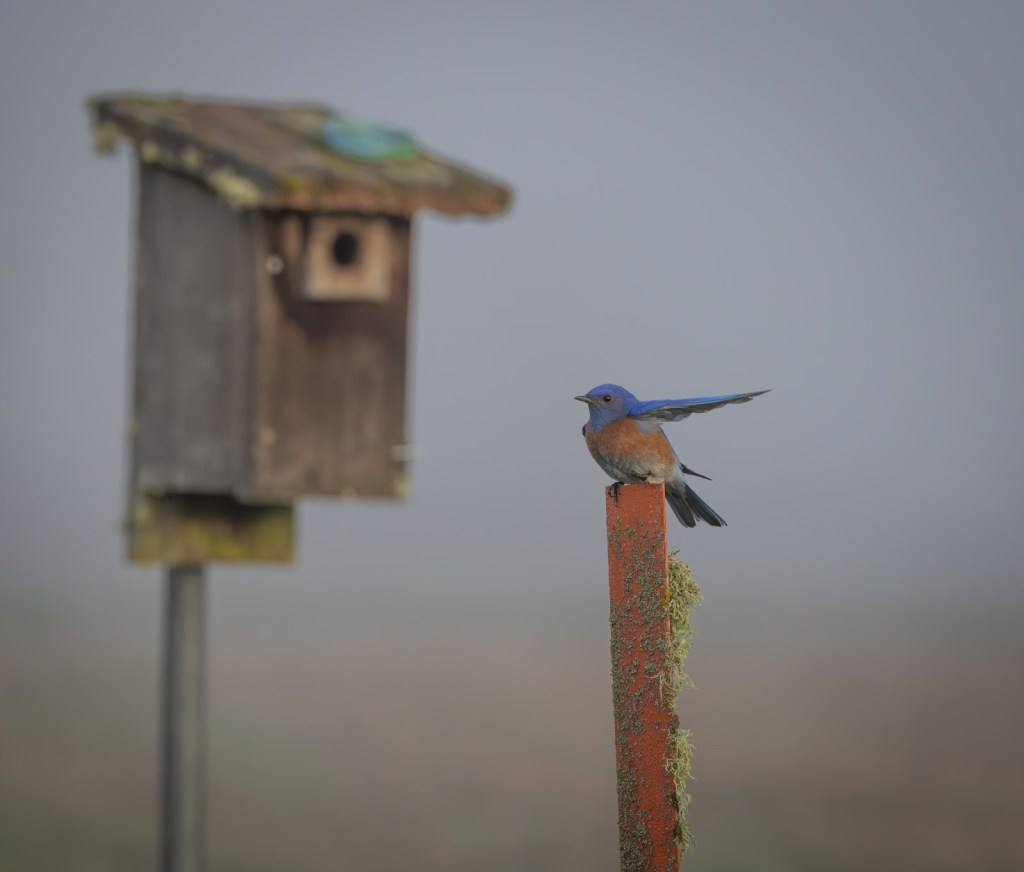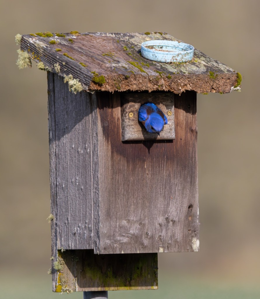 According to Cornell Lab of Ornithology, Champoeg State Heritage Area near Newberg, Oregon is home to the northernmost spot in the continental United States, where resident pairs of Western Bluebirds have been spotted. I can happily say that yes, there is a male and female using one of the nesting boxes this year right alongside the walking trail down the hill from the main Champoeg parking lot. They don’t seem bothered by runners, bicycles, strollers, and dogs on leashes just a few feet away.