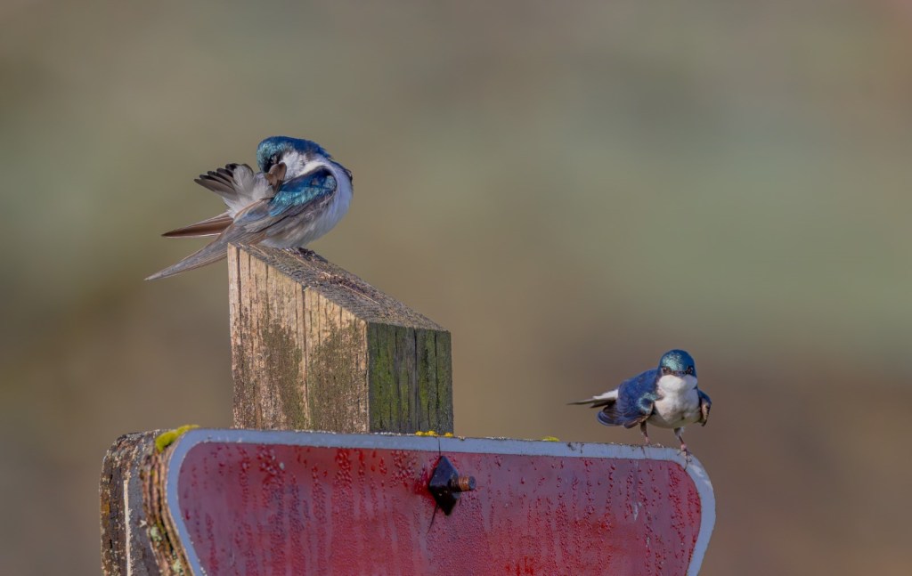 The Tree Swallows, cutting through the air with precision dives and turns of their own, did not conceal their intentions, hoping for a momentary dereliction of duty on behalf of the bluebirds, in order to execute a lightning-quick nesting box coup.