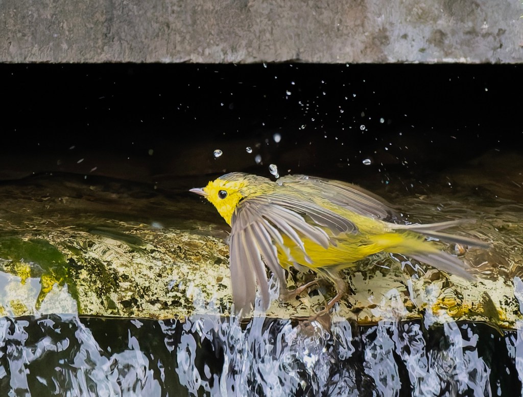Tattered, exhausted and hungry. It’s hard to imagine what this tiny warbler endures on its long migration. You can see the feather damage in this female, as she makes use of a water feature.