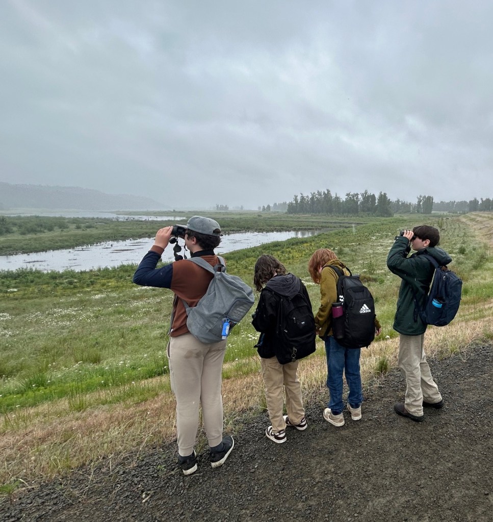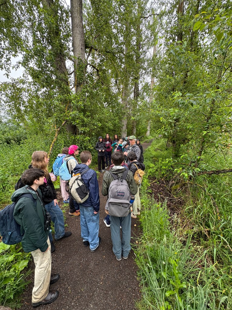 We are middle school students from Sunnyside Environmental School in Portland. Recently (May 29, 2025) we went on a field trip to Steigerwald Lake National Wildlife Refuge with Ken Pitts as our guide. We learned quite a bit about the birds that live there. The experience was magical. We got to see dozens of swallows gliding through the air performing stunts like loops and dives. Great egrets waded in the marshy land hunting for fish, striking their beaks at the water. Cottonwood floated through the air and landed on the tall grass which looked very cool, but did give a lot of us allergies. It was worth the allergies though, to see all those birds. We also got to learn how to pish in order to attract birds, although we think we may have scared them away with all 26 of us trying to imitate them! There were lots of people there to enjoy nature, and we were very excited that we got to visit.