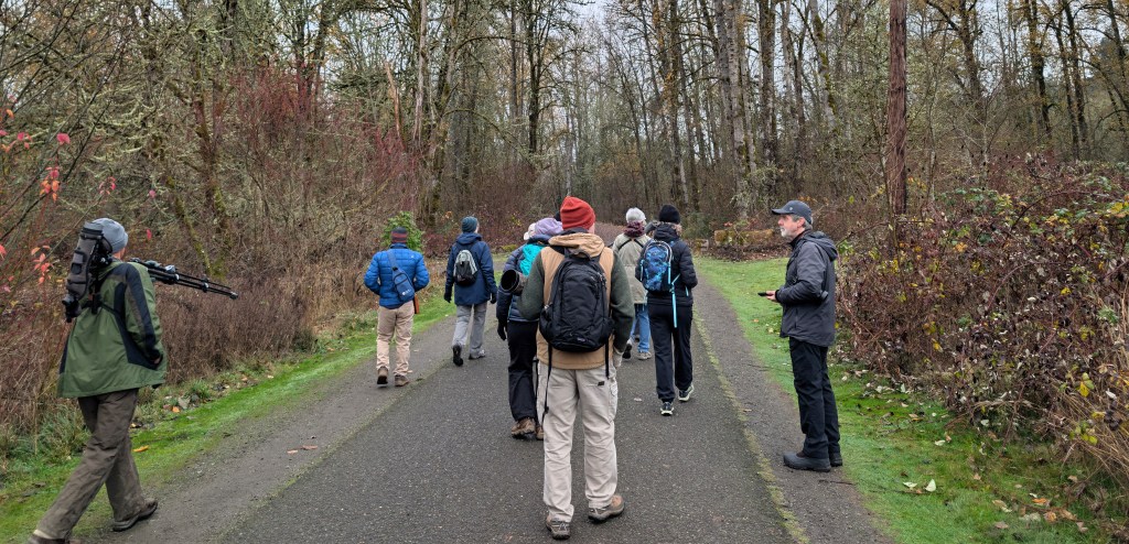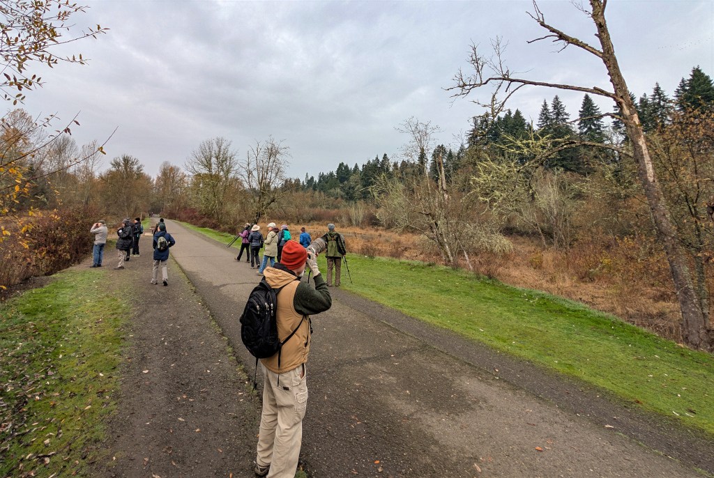 Further on, we enjoyed wonderfully close views of mixed species feeding flocks consisting of Black-capped Chickadees, Brown Creepers, and Kinglets (both Golden and Ruby-crowned) as their numbers passed alongside, over, and even through our group. Later, Virginia Rails could occasionally be heard in the wetlands but stayed otherwise hidden. In those wetlands we added American Wigeons, Northern Pintails, and a Hooded Merganser to the duck tally. Where the Virginia Rails were shy, the Song Sparrows were feeling flamboyant. Around 47 of them regaled us from low and open perches, their barking chips ubiquitous and inescapable. Throughout the morning, we found nearly the full slate of Clark County’s expected woodpeckers with Downy, Hairy, Pileated, and Northern Flicker all present (and vocal about it). Red-breasted Sapsuckers were the single holdout from Family Picidae despite the prevalence of their telltale wells on the trunk of nearly every tree.