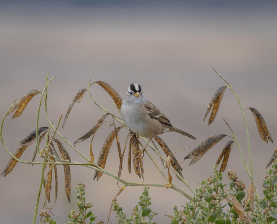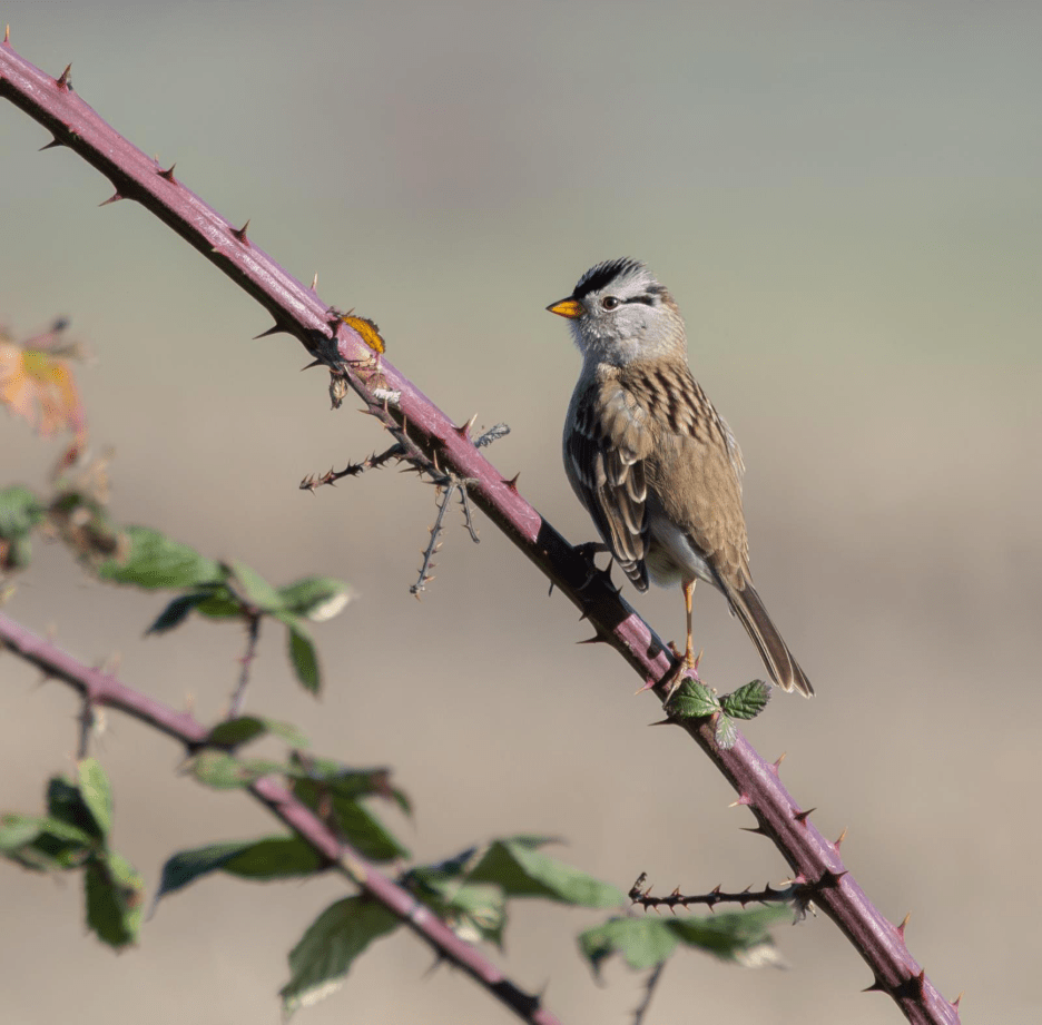 In the fall of 2024 husband George and I drove down the coast from Portland, Oregon to Muir Beach, California to attend a wedding. Stopping regularly along the way to check out parks and refuges, we found flocks of White-crowned Sparrows everywhere, atop hedgerows and tangles of berry bushes, along forest edges and shrubby borders on cliffs above the ocean. I was amazed at how prolific they were and was delighted by our daily encounters with those striking black and white heads. Their serenade of cheerful song was the soundtrack of our trip. But once back home in Portland my bird interest swiftly pivoted towards the arrival of favorite winter birds such as Short-eared Owls and Tundra Swans. I forgot all about the sparrows, until now, a year later.