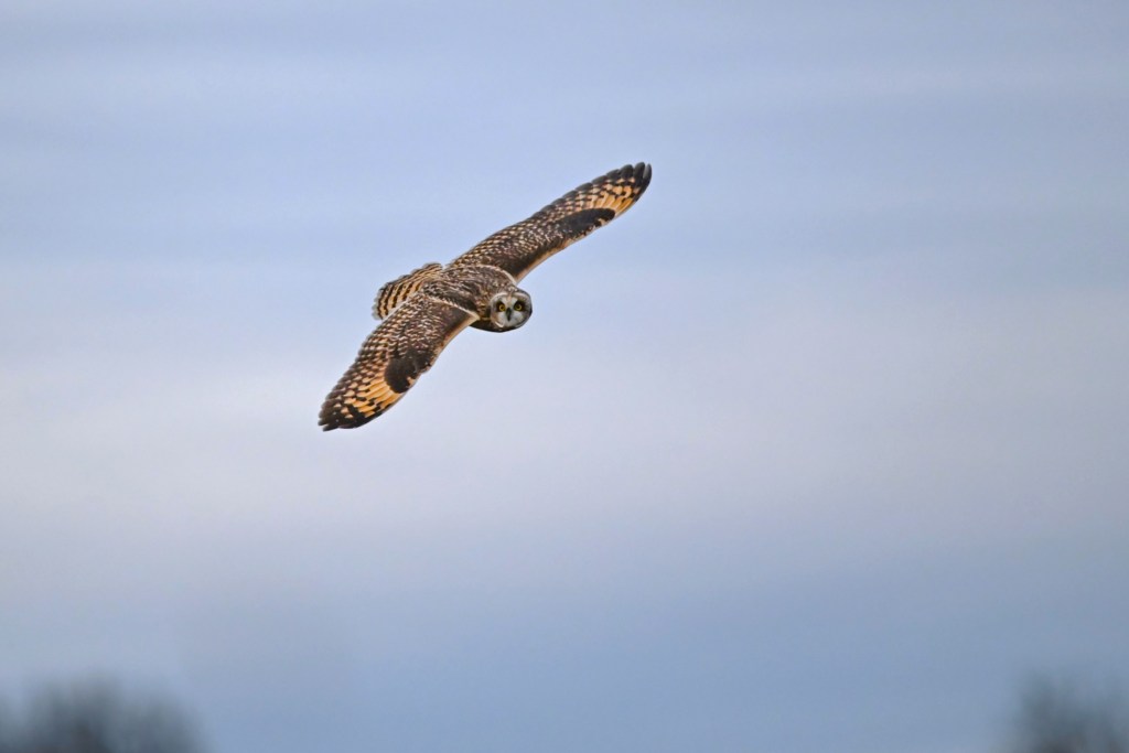 With the trees in prime fall foliage, I hoped that one of these owls would be able to fly low enough to get the gorgeous fall colors in the background, but my prayers weren’t answered. Despite the owls coming quite close, none of my pictures turned out very well. Perhaps it was my inexperience of photographing in low-light conditions or me being too focused on observing the Short-eared Owls through my binoculars, but it was still a fantastic experience. As the sun gradually melted back into the mountains and out of sight, I knew I had to come back and give photographing these mesmerizing owls another go. Although I didn’t get any good pictures, I got plenty of excellent long and uninterrupted views of these owls as they hunted at dusk. The Short-eared Owls would fly in large circles and upon hearing rustling in the grass or spotting the occasional exposed rodent or other food item, they flew closer to the marshes, their powerful wingbeats cutting through the grass until they had locked onto the prey. With a swift and debonair twist of the wings, they would plummet and disappear into the reeds. These owls blend in quite well with the grasslands and marshes they frequent and call home, with brownish stripes dripping down their chest to their underbelly, and a prominent facial disc with cat-like whisker shapes on the auriculars. The most striking feature on the Short-eared Owls are without a doubt the dense LED-bright yellow eyes that could pierce through stone.