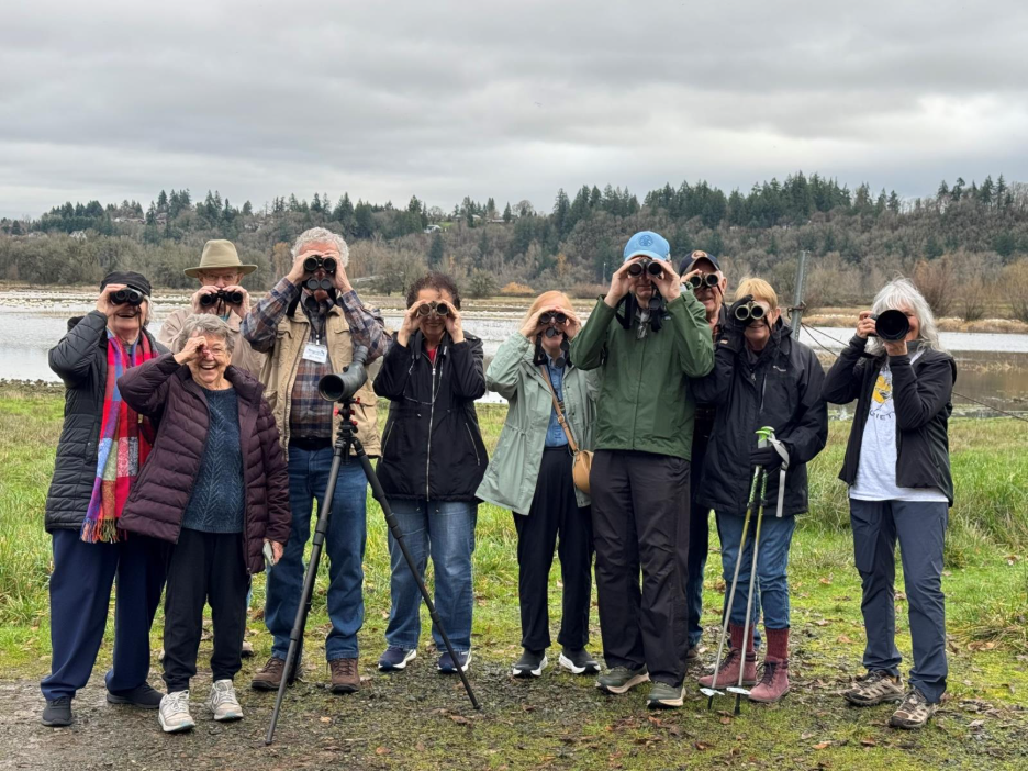Joe Ybarra, delightful employee of University Village, drove the facility bus for this outing and due to the vehicle’s height, we enjoyed an elevated and advantageous view across the refuge. VAS provided binoculars for the group and there was a lot to see. Ken’s eBird checklist includes 37 species of birds. Ridgefield NWR eBird Checklist 12/11/25.
