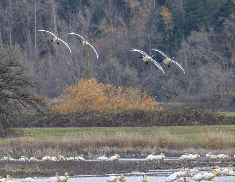 On the refuge, migratory birds arrive daily. A steady succession of rain showers has been crafting the perfect wetlands environment for wintering waterfowl. Trumpeter and Tundra Swans, Canada and Cackling Geese plus many duck species, are populating lakes and sloughs. If you want to observe large birds taking off and landing on water, this is the place.