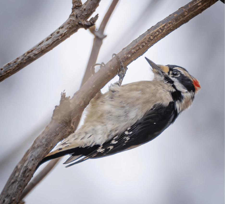 In addition to our sightings, the soundscape was remarkable as well. Flocks of geese, swans and ducks loudly announced their comings and goings and Sandhill Cranes chimed in with their archaic-sounding calls. All in all it was quite a wonderful experience. The most surprising bird encounter was that of a Downy Woodpecker, working a tree right beside the mid-loop restrooms, oblivious of our endeavors to observe its movements up and down and all around. We had exited the van to walk a short year-round trail to the wooden bird blind and there it was pecking away just above eye level.