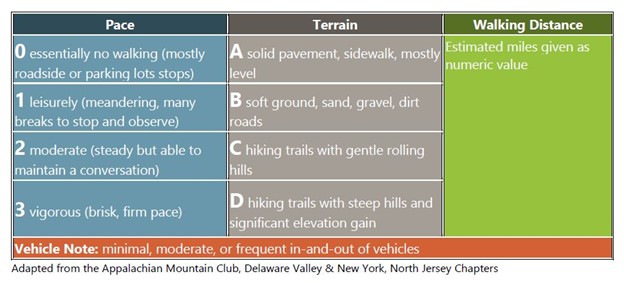 Trip travel type expectations: Pace: 1 Terrain: some A-B < one mile walking.