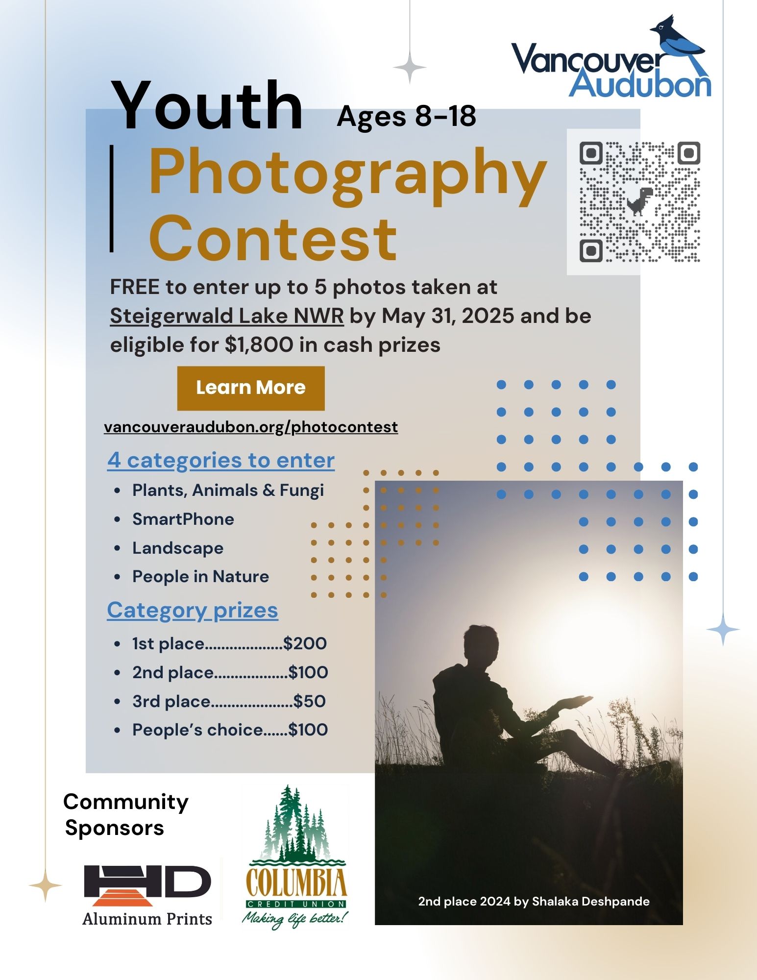 Vancouver Audubon Society (VAS) has taken the reigns for running the 2024-25 youth photography contest, after the Gorge Refuge Stewards (GRS) closed their doors on September 30, 2024. The GRS board gifted VAS enough money to continue an eleven-year effort to engage youth with nature photography for another five years.