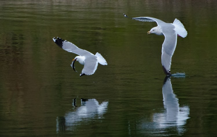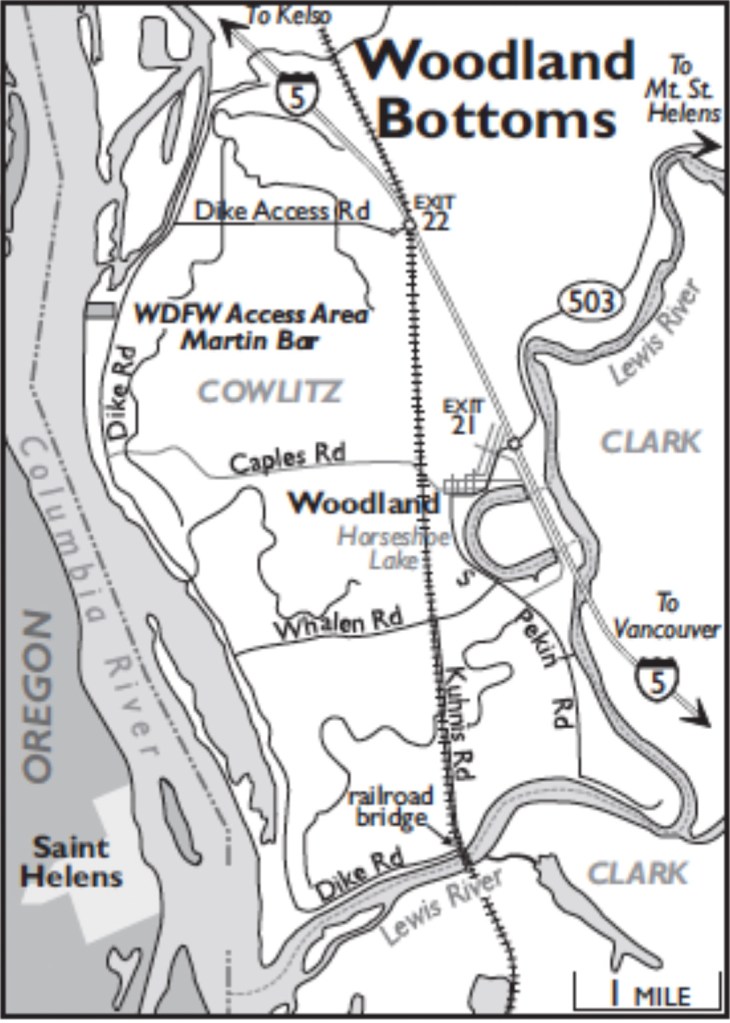 Return to the intersection with Dike Access Road and continue south on Dike Road for 0.7 mile to the WDFW Access Area at Martin Bar, on the Columbia River. (A daily fee or Discover Pass required; the Port of Woodland owns the surrounding land and is seeking to buy the WDFW site; a port pass will be required if the sale occurs.) The wave-protected waters around the offshore sandbars here and for the next four miles harbor loons, grebes, and waterfowl, while geese and gulls roost on the sandbars.